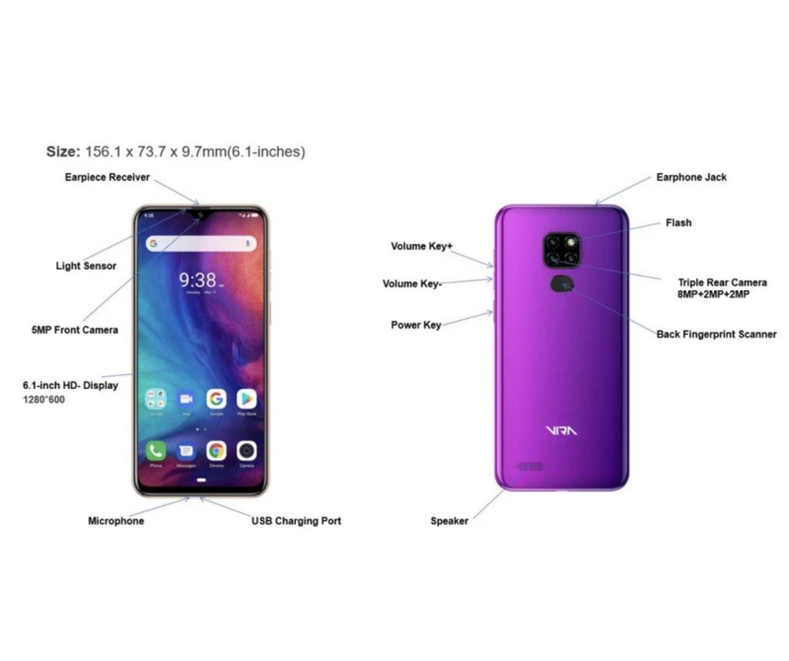 ویرا مدل V5 گوشی هوشمند میانردهای است که در کنار بهره بردن از مشخصات فنی مناسب و قابل قبول، قیمت مقرون بهصرفهای هم دارد. طراحی این گوشی میانرده طراحی آشنا و کاربر پسندی است. در نمای روبهرویی این ویرا V5 به صفحهنمایش 6.1 اینچ با رزولوشن 600×1280 پیکسل مجهز شده که برای طراحی صفحهنمایش از ناچ واتردراپ استفاده شده است. بریدگی قطرهای شکل ناچ در قسمت بالایی و مرکزی صفحهنمایش سنسور دوربین سلفی با رزولوشن 5 مگاپیکسل را در خود جای داده است. در قسمت پشتی هم یک سنسور دوربین اصلی با رزولوشن 8 مگاپیکسل در کنار دو سنسور 2 مگاپیکسل از نوع ماکرو و سنجش عمق، سنسورهای دوربین سهٰگانه این گوشی هوشمند میانرده را تشکیل میدهند. سنسور دوربین اصلی این گوشی، توانایی ضبط ویدیو با حداکثر کیفیت 1080p و سرعت 30 فریم در ثانیه را دارد. قابلیت امنیتی و بسیار پرکاربرد حسگر اثر انگشت هم از نوع فیزیکی در قسمت پشتی قرار گرفته است. باتری با میزان ظرفیت 3500 میلیآمپرساعت در نظر گرفته شده برای این گوشی هوشمند میانرده هم، به ازای هر بار شارژ 100 درصدی، طول عمر مفید (زمان آماده بهکار) بسیار قابل قبولی را ارائه میکند